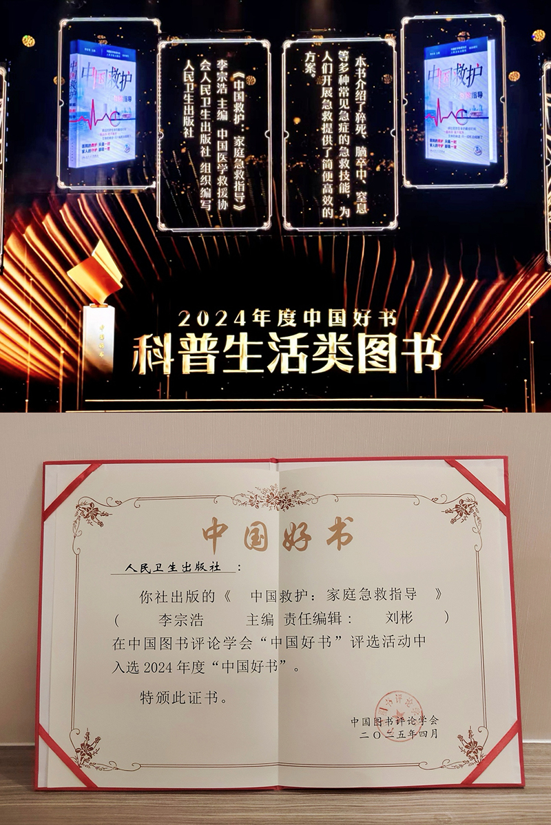 4月23日“世界读书日”,在第四届全民阅读大会“春风里·中国好书”发布活动上揭晓了2024年度中国好书名单,人民卫生出版社《中国救护——家庭急救指导》荣获2024年度中国好书。人民卫生出版社总经理、党委副书记李新华参加颁奖典礼。