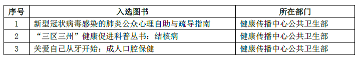 2020年10月16日,由中央宣传部和农业农村部主办的2020“农民喜爱的百种图书”在四川成都天府书展上正式公布。人民卫生出版社《新型冠状病毒感染的肺炎公众心理自助与疏导指南》《“三区三州”健康促进科普丛书:结核病》《关爱自己从牙开始:成人口腔保健》成功入选。